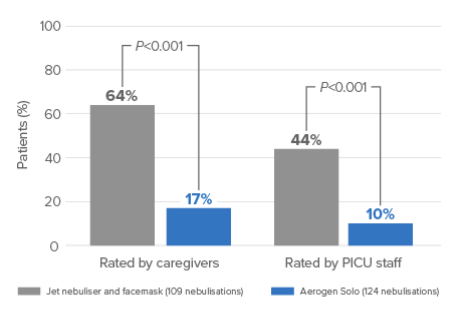أدى استخدام أيروجين سولو بالاتصال المباشر لتقديم العلاج البخاخي إلى مزيد من الراحة والرضا مقارنةً باستخدام البخاخات النفاثة بالإضافة إلى قناع الوجه عند الرضع المصابين بأمراض خطيرة والذين يتلقون دعمًا تنفسيًا عالي التدفق.18